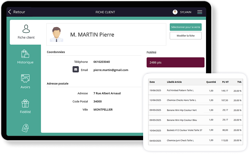 The customer file contains essential information for your management: last name, first name, organization, contact details, sales history, current credit, customer account balance, loyalty points balance.